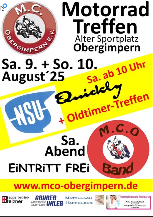 Seit 2019 haben wir mit dem Quicklytreffen ein weiteres Highlight auf unserem Motorradtreffen integriert, welches viele NSU Freunde aus fern und nah nach Obergimpern zieht. Dieses Quicklytreffen wurde bis dato auf dem Gelände des Kleintierzuchtvereins ausgerichtet.